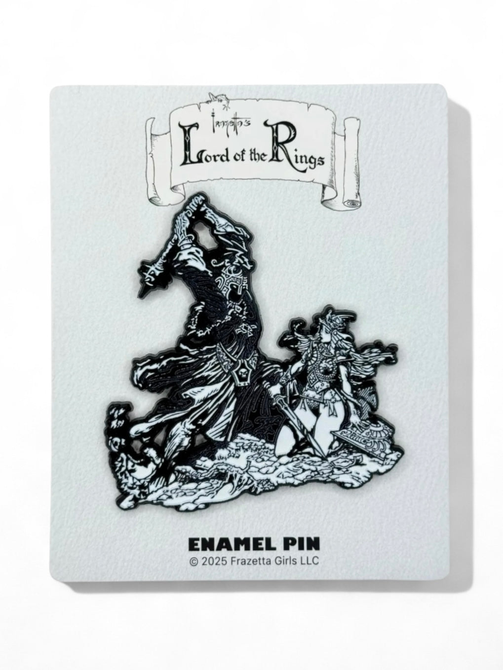 Inspired by Frank Frazetta’s original Eowyn vs Nazgul Lord ink drawing from his iconic Lord of the Rings portfolio, this 2.75-inch enamel pin brings his legendary design to life with intricate detail and premium craftsmanship. Finished in black nickel plating featuring double rubber clasps. Each pin includes a graphic cardback for display.