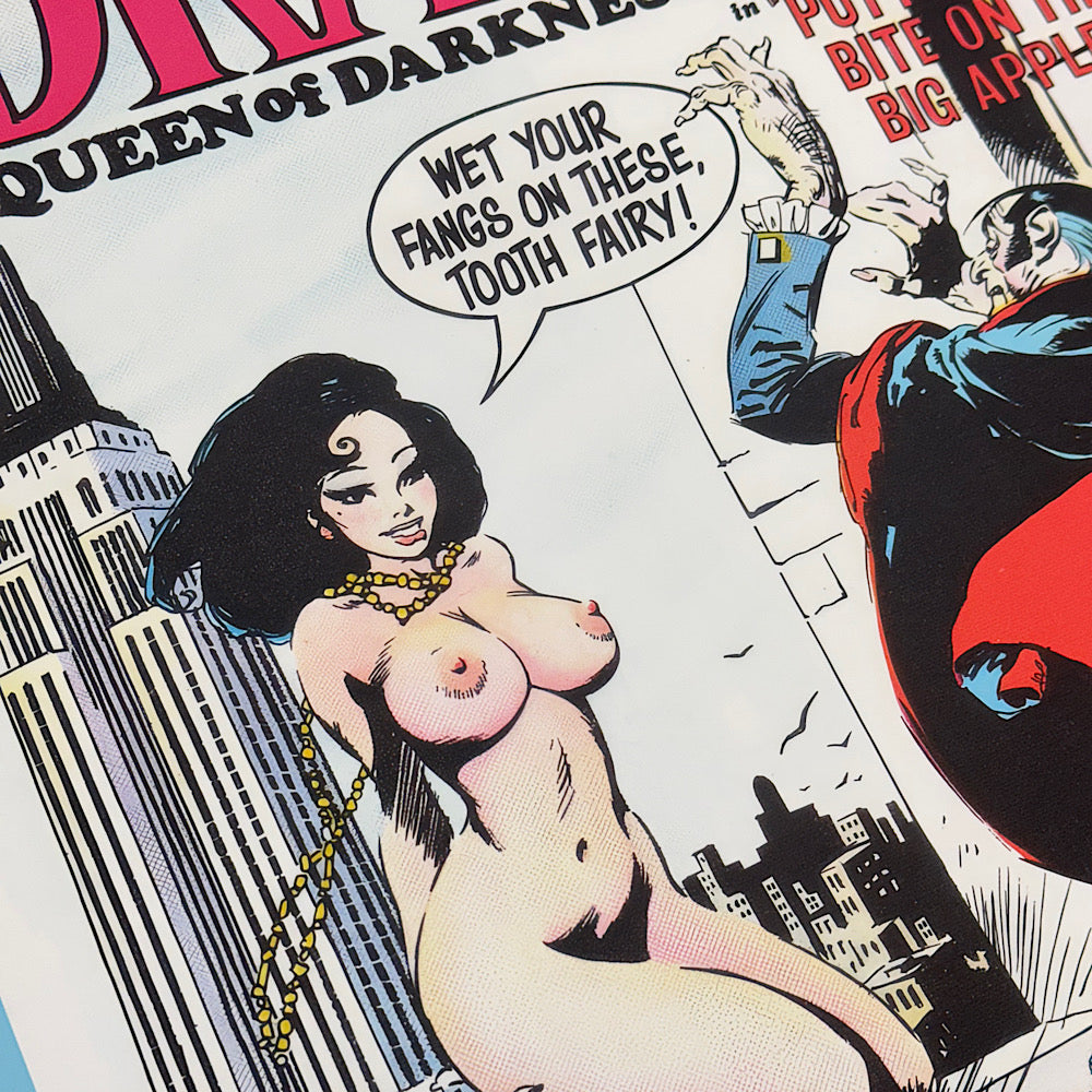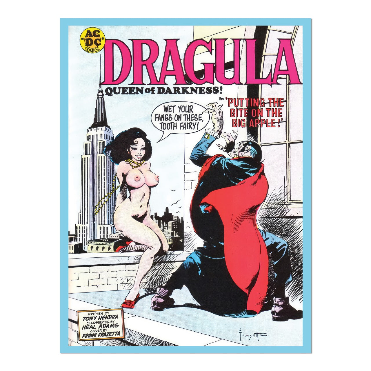 Originally created for National Lampoon in 1971, Frazetta’s Dragula: Queen of Darkness cover was a striking parody of vampire lore, blending his signature dark fantasy style with satirical edge. Now available as an 18 x 24-inch print on 230g canvas-textured art paper, this open-edition piece captures the power and intrigue of Frazetta’s original vision.