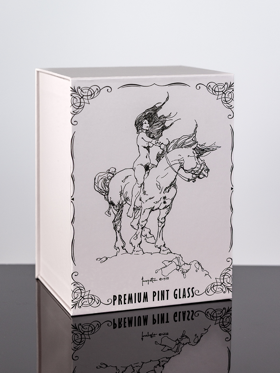 This 16oz pint glass features Frank Frazetta’s masterful Girl on Horse pen and ink work. Made for everyday use or display, each glass comes packaged in a custom Frazetta gift box.