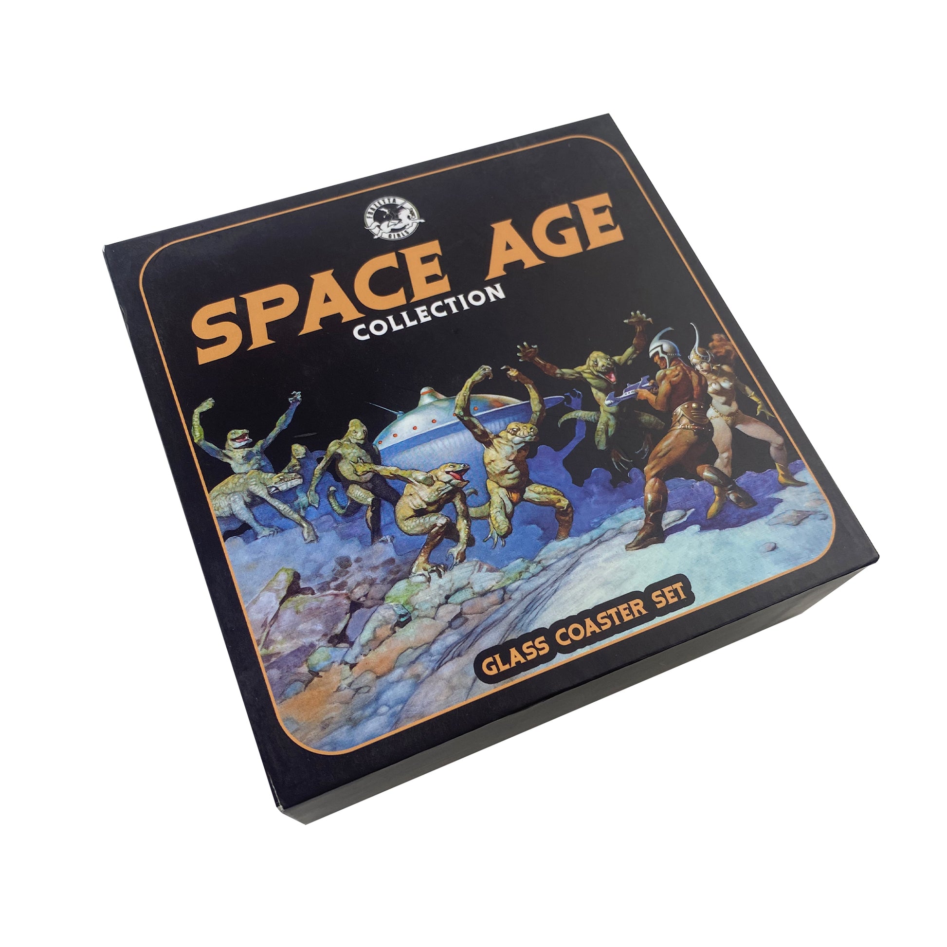 The premium SPACE AGE tempered glass coaster set featuring some of Frazetta's most iconic space themed works. Durable toughened glass with high-temperature resistance and a non-slip bottom. Premium housing box with foam insert included.